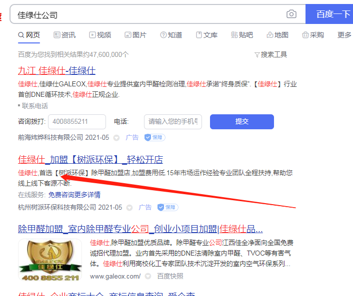 杭州樹派環(huán)保科技有限公司利用我司商標"佳綠仕"進行百度搜索關(guān)鍵詞宣傳,嚴重影響我司合法權(quán)益。